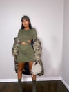 You're going to love this green set! It has cut outs on the top, shoulder pads for structure and flare sleeves. The skirt has a knotted front. Fabric is crinkle and stretchy. Model wears a size small.