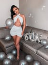 The 60K dress is perfect for a birthday look or special occasion. It has ruching on the skirt which is great to conceal any lady lumps. The light grey color is gorgeous on every complexion. Fabric is very stretchy. Model wears a size small.